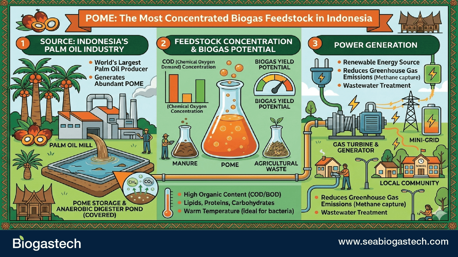 Palm Oil Mill Effluent (POME) is one of the strongest organic waste streams globally, making it ideal for anaerobic digestion.